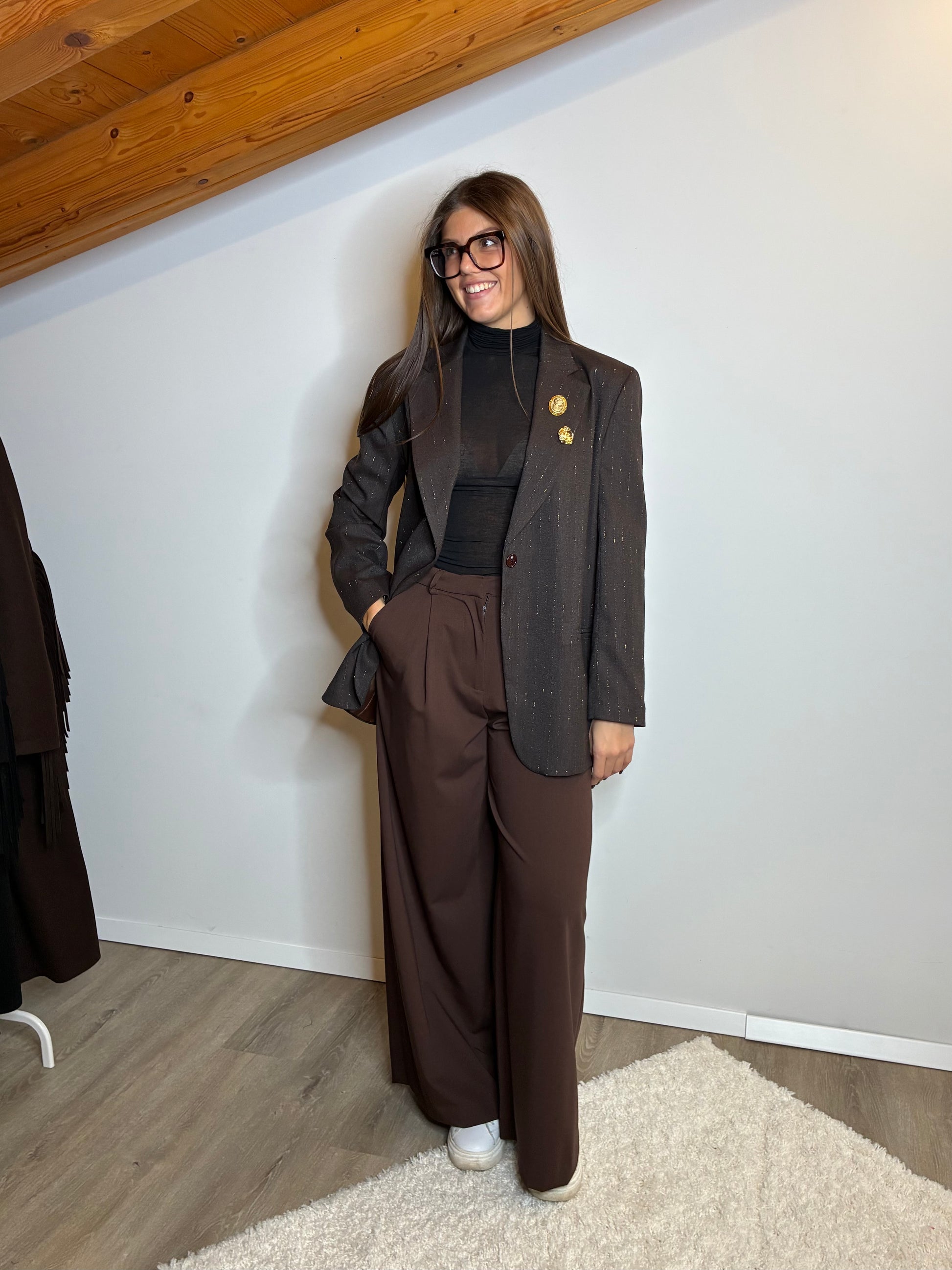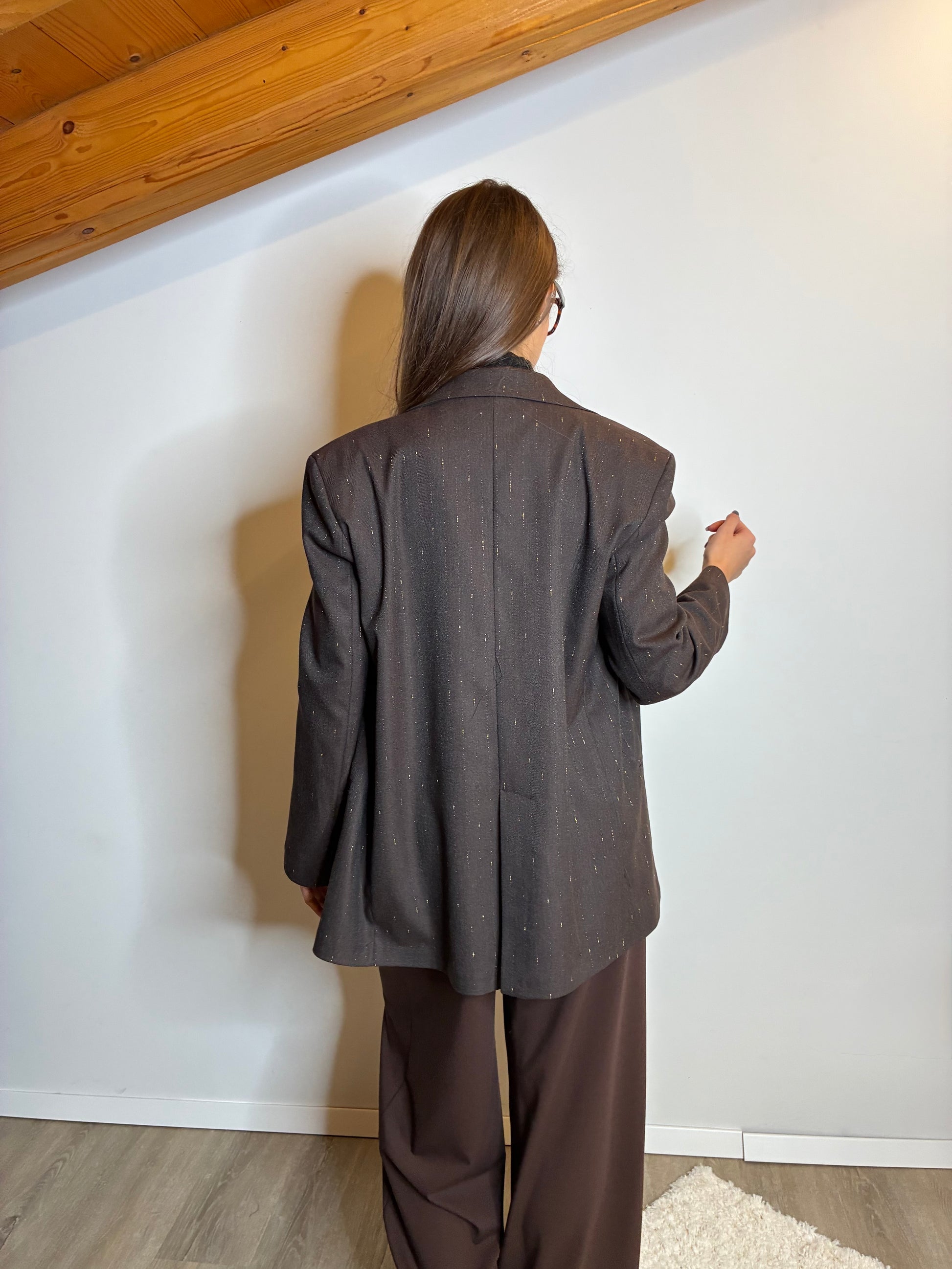 Giacca monopetto con rever a lancia e chiusura a un bottone; colore marrone con fili metallici dorati che creano un leggero effetto gessato; dettagli spille sul rever; tasche a filetto frontali.