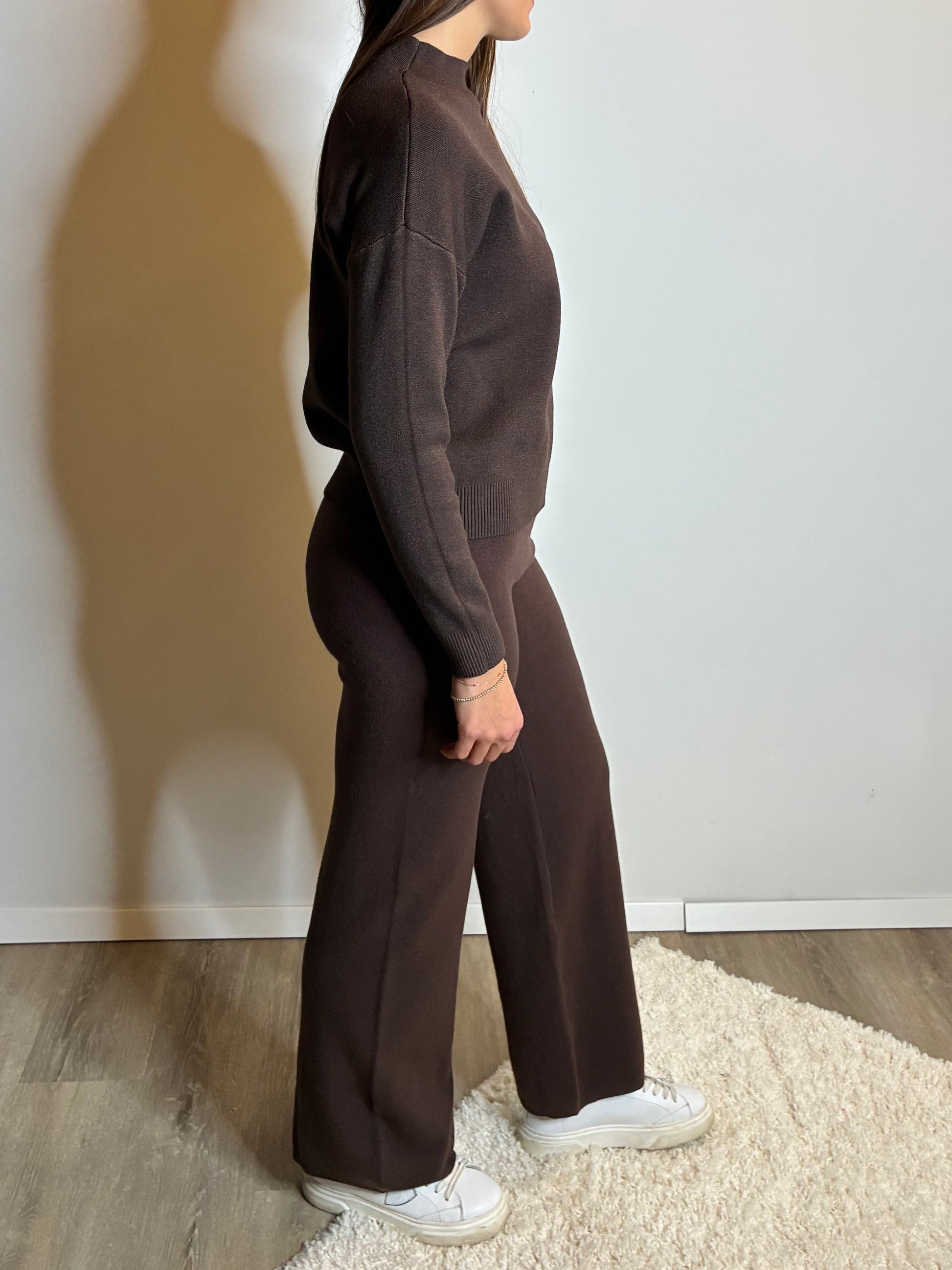 Completo in maglia color marrone. Maglia con collo a cratere e fit a scatoletta; pantalone gamba dritta con elastico in vita.