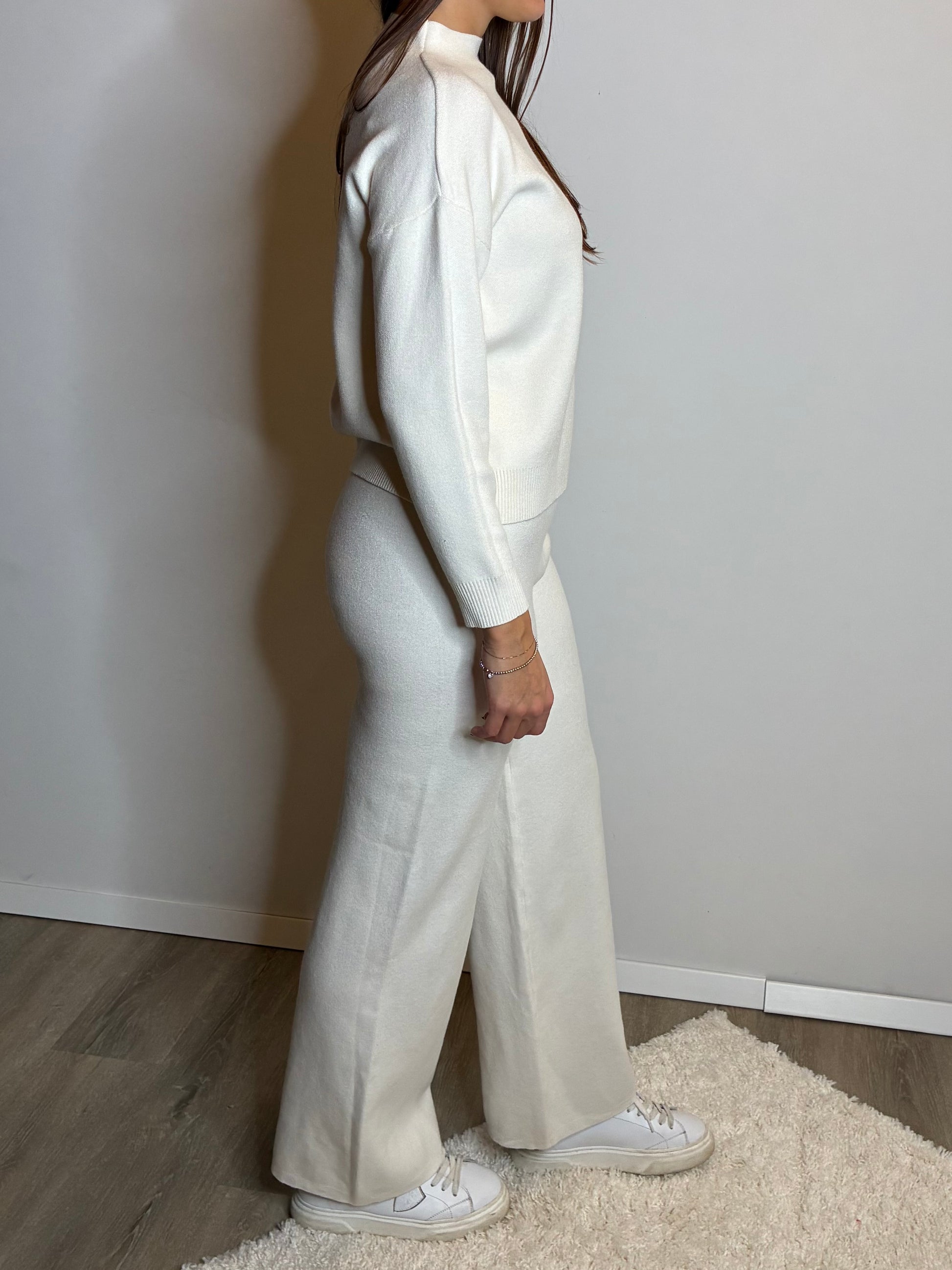 Completo in maglia color panna. Maglia con collo a cratere e fit a scatoletta; pantalone gamba dritta con elastico in vita.