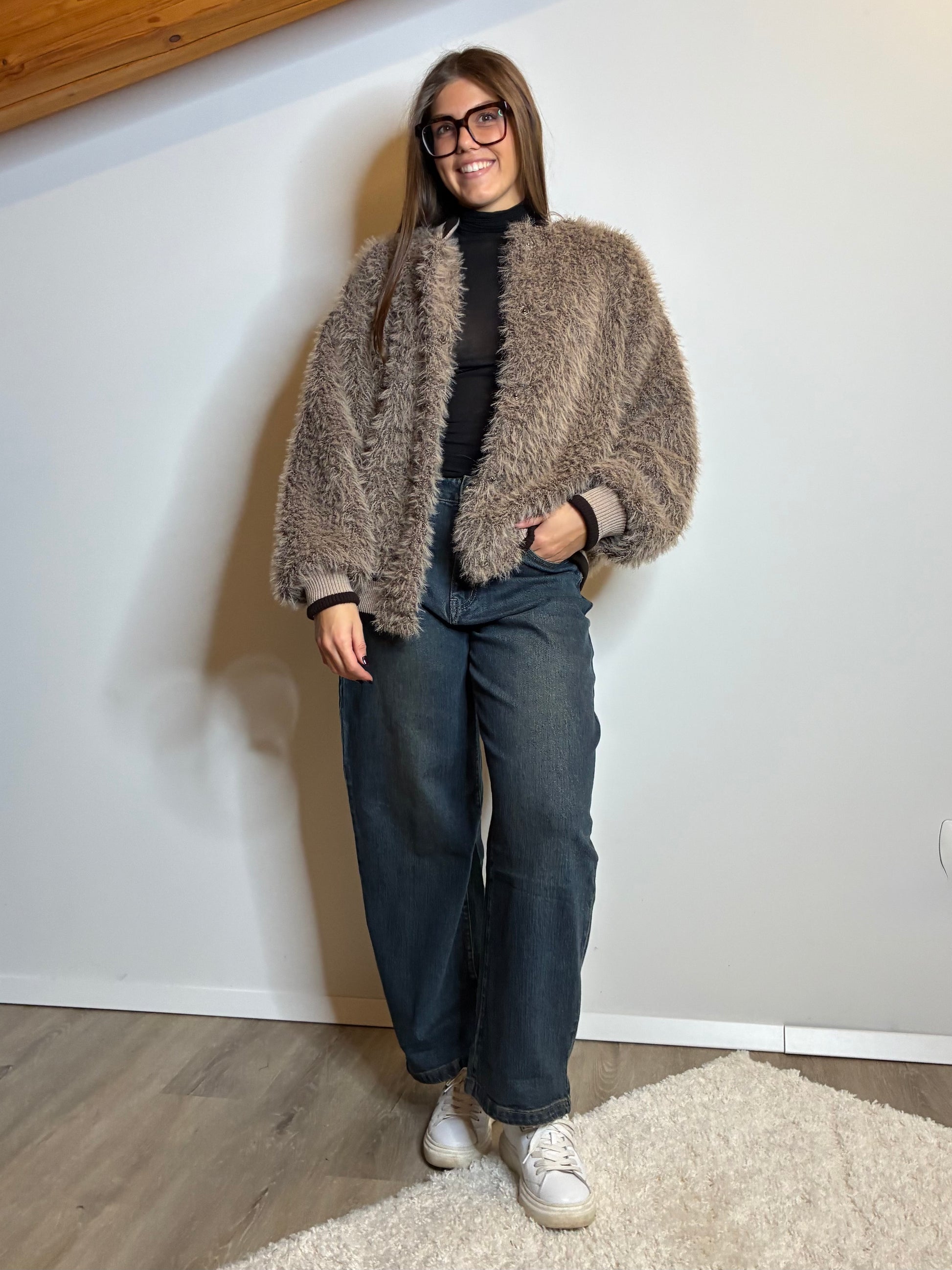 Giacca bomber effetto pelliccia; colore: beige-marrone taupe; dettagli colletto, polsini e orlo in maglia a costine in tinta più chiara con borso scuro a contrasto; chiusura con zip.