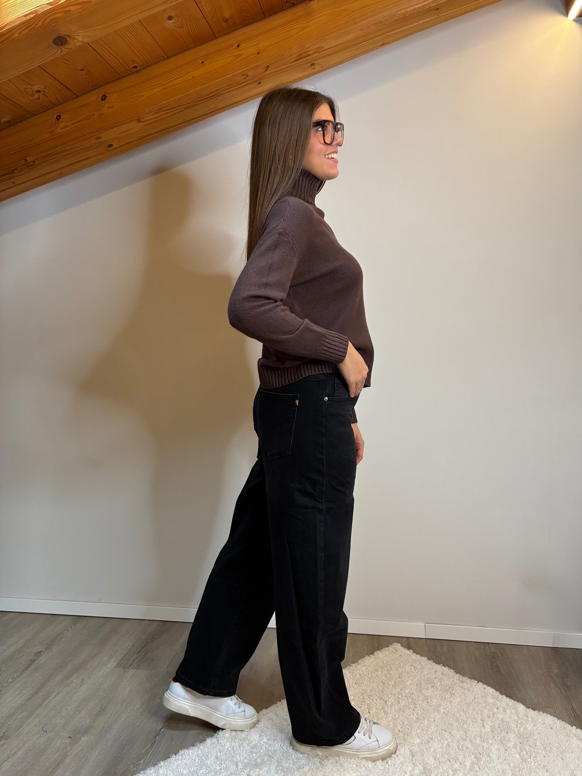 Maglione con collo alto cioccolato, dettaglio spalla scesa, fit leggermente a scatoletta.