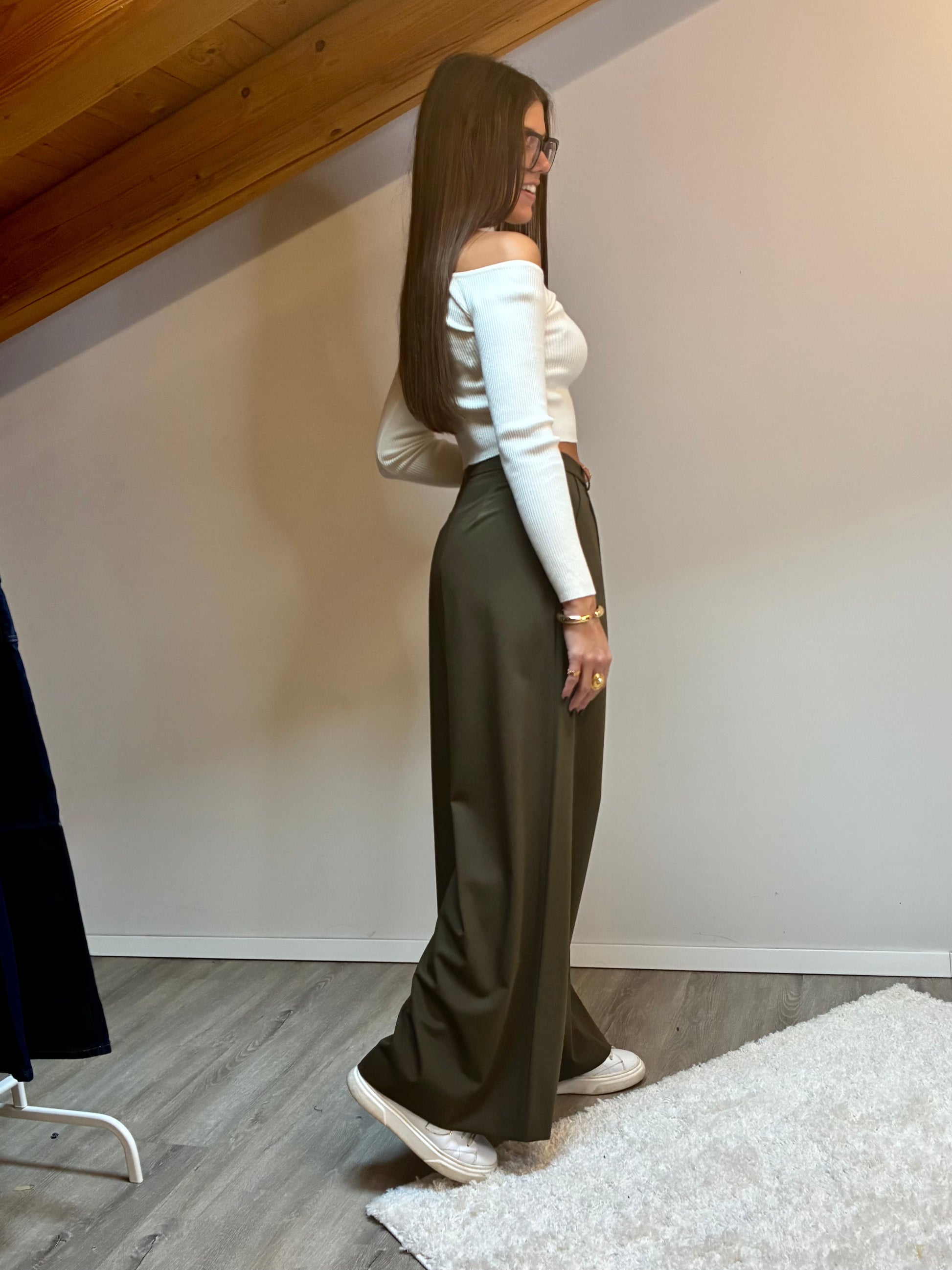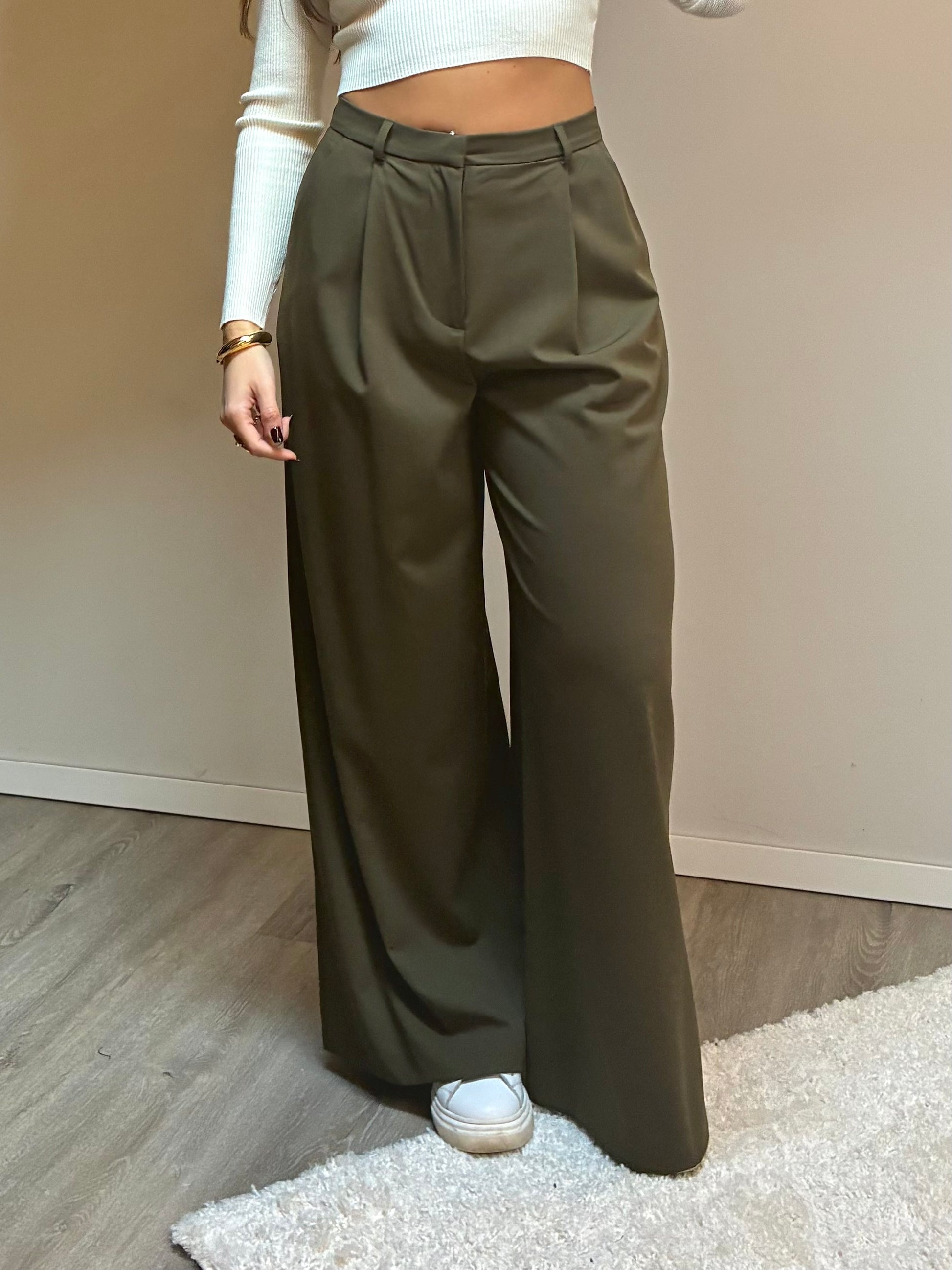 Pantalone sartoriale color oliva. Pinces sul davanti, gamba ampia.