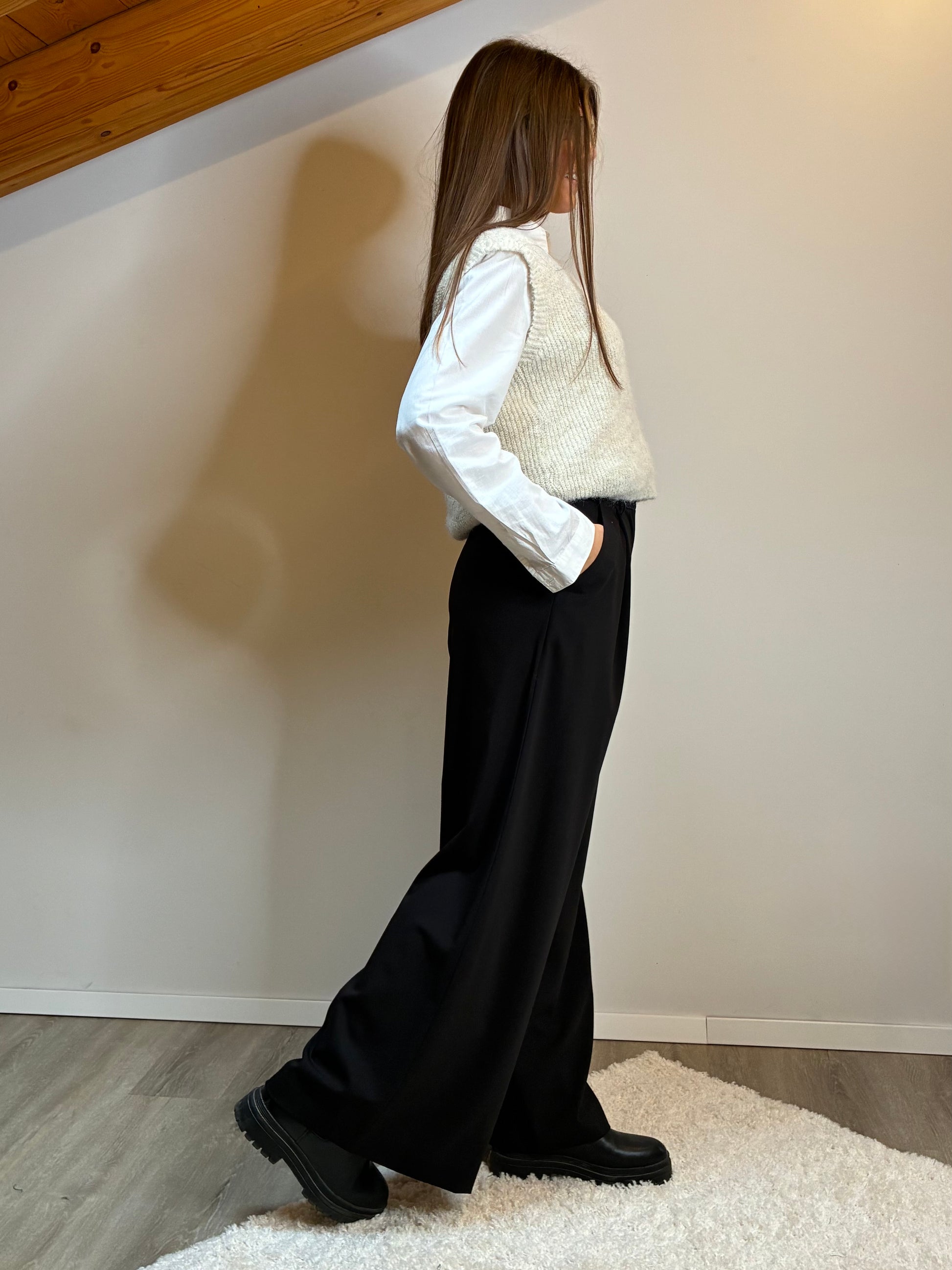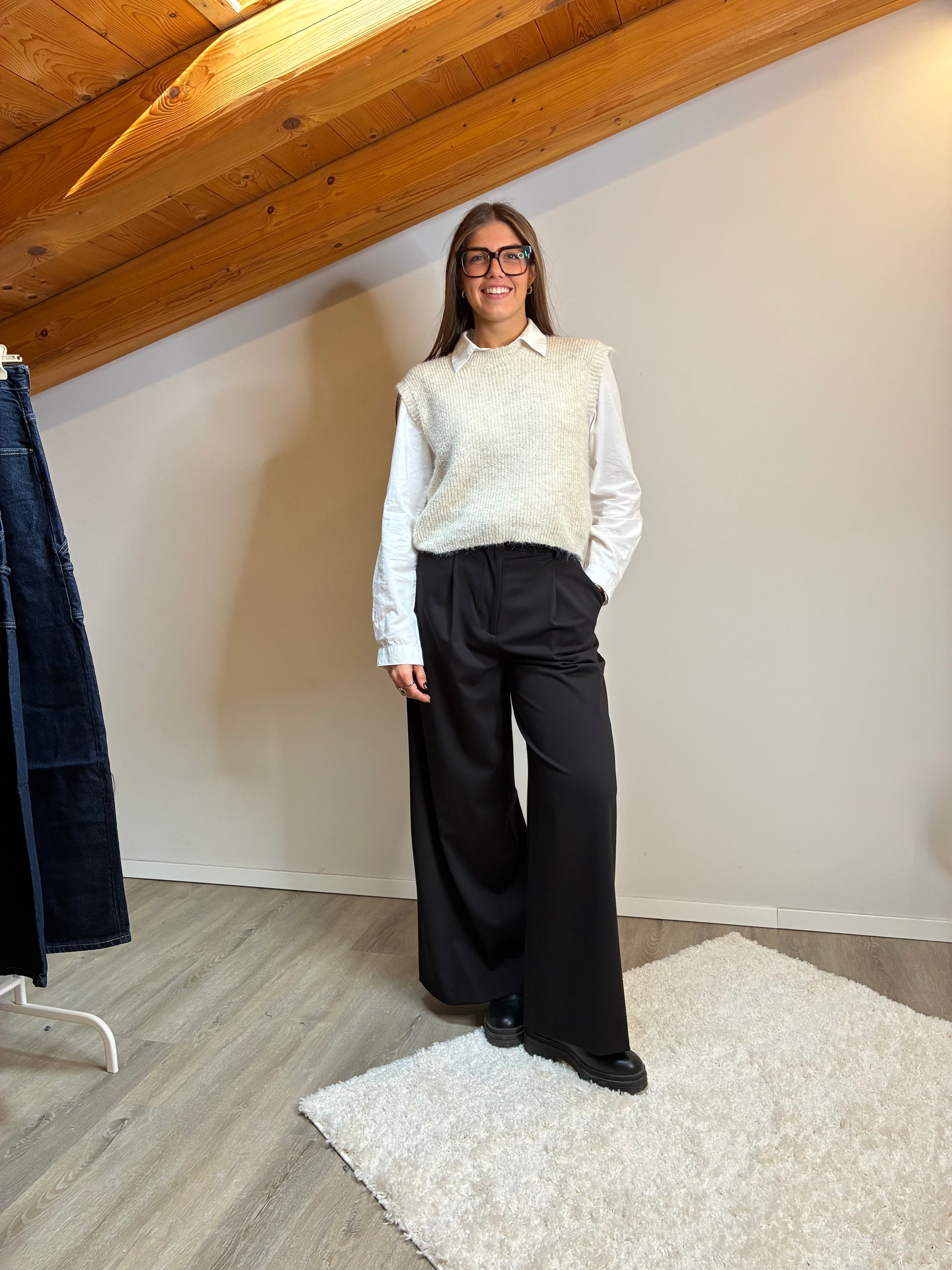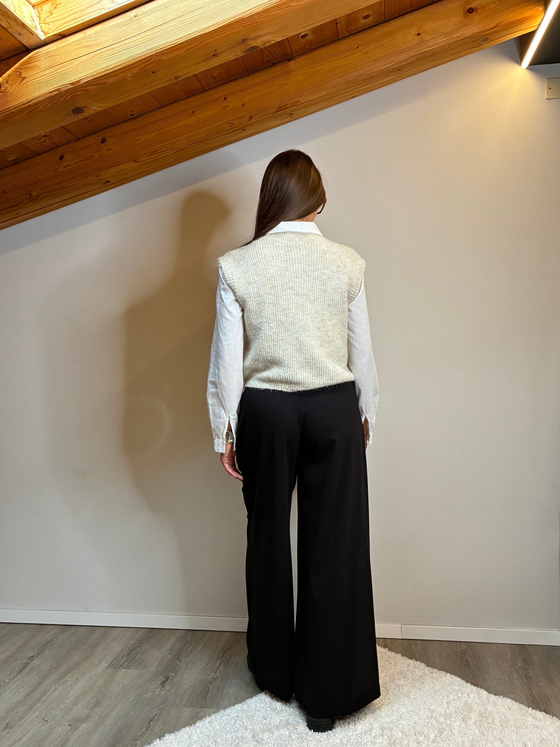 Pullover smanicato misto lana color burro con filo lamè e micropaillettes.